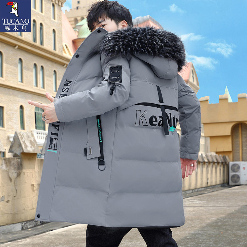 啄木鸟中长款棉衣男士冬季新款连帽毛领加厚保暖潮牌外套青年棉服