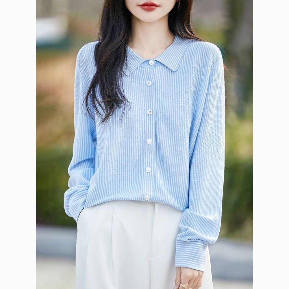 26春秋款POLO领精纺羊毛开衫女条纹拼色针织毛衣宽松休闲外套衬衫