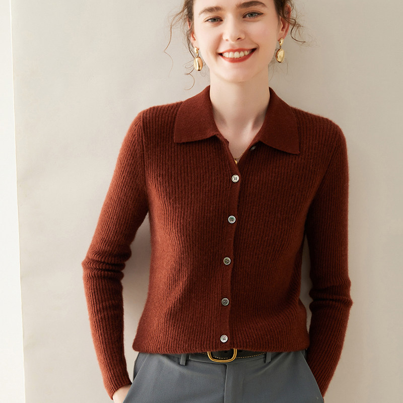 高级感穿搭羊绒衬衫女纯色山羊绒修身POLO领毛衣针织开衫羊毛衫