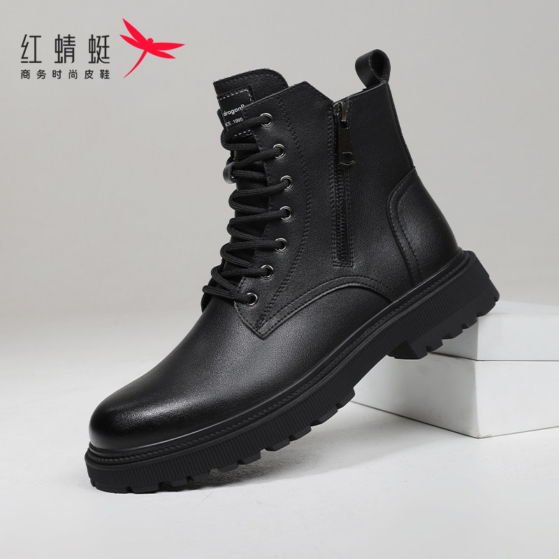 红蜻蜓马丁男鞋冬季加绒保暖男士厚底高帮真皮英伦风黑色皮鞋男款