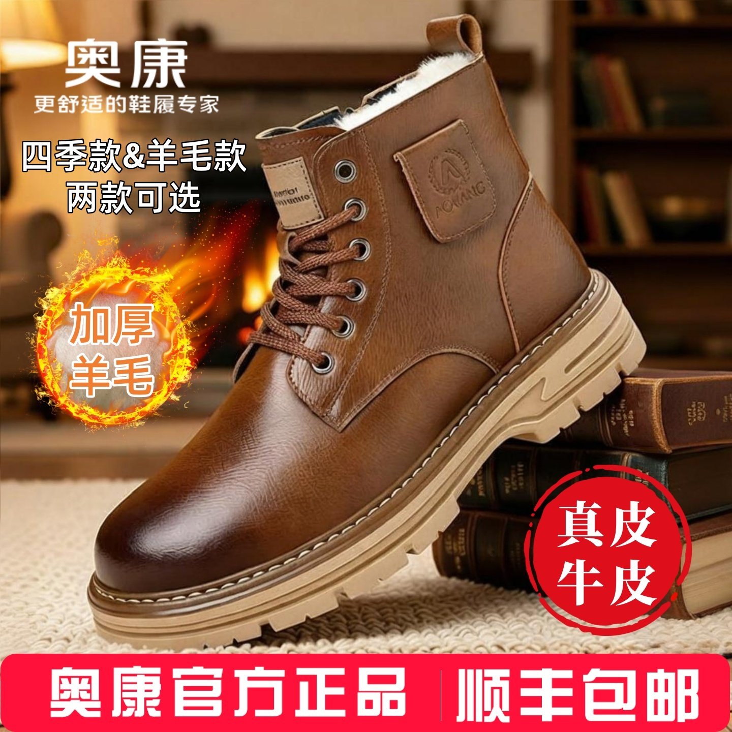奥康正品新款加绒真皮男士马丁男鞋保暖羊毛高帮复古工装防滑休闲