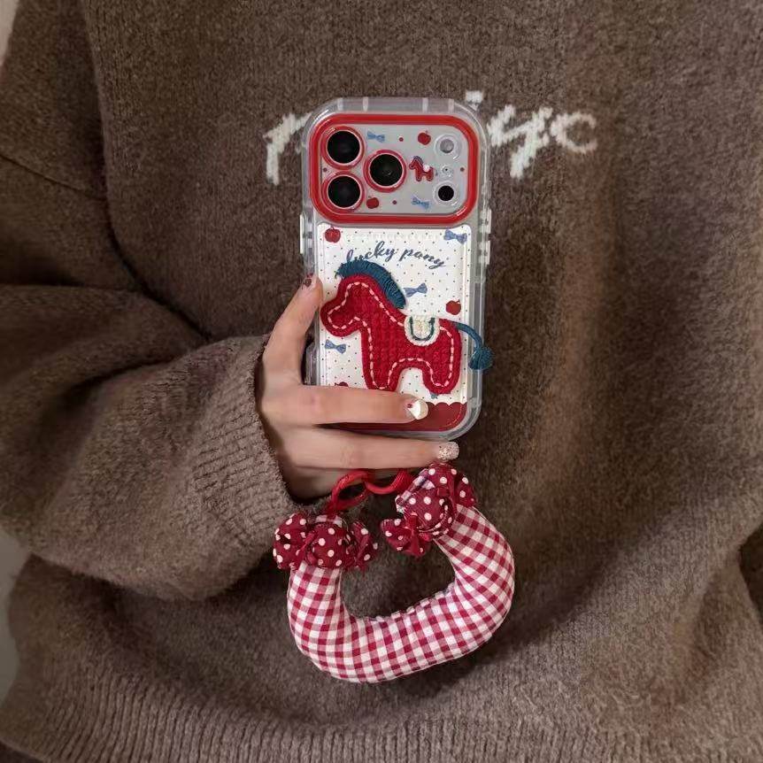 新款编制流苏新年红色刺绣小马苹果17promax适用16pro卡通艺术15ins风保护套14挂绳13防摔全包手机壳女