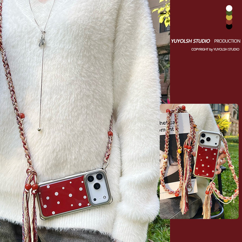 【浆果啵啵】酒红白波点高级电镀银手机壳滴胶适用于苹果17Pro流苏挂绳华为mate70背带斜跨小米17Pro链条斜挎