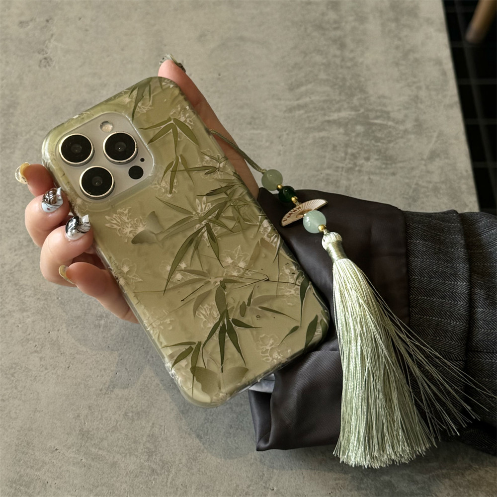国潮绿色竹子流苏挂饰适用iPhone15苹果16Promax手机壳13个性14女17Promax防摔Max保护套15Promax个性14Pro