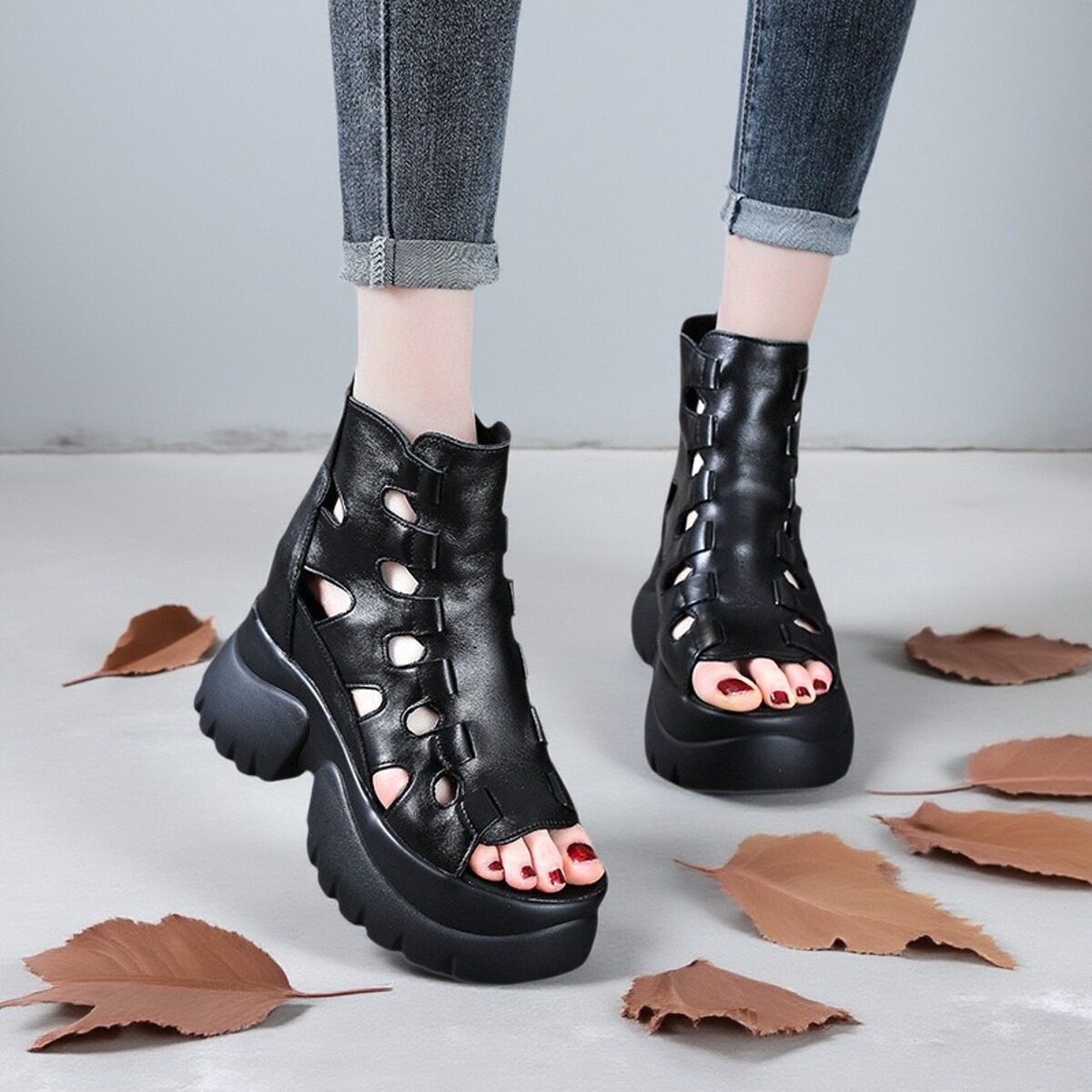 欧洲站真皮显瘦增高9CM凉鞋女夏季透气镂空厚底短靴马丁靴高帮鞋
