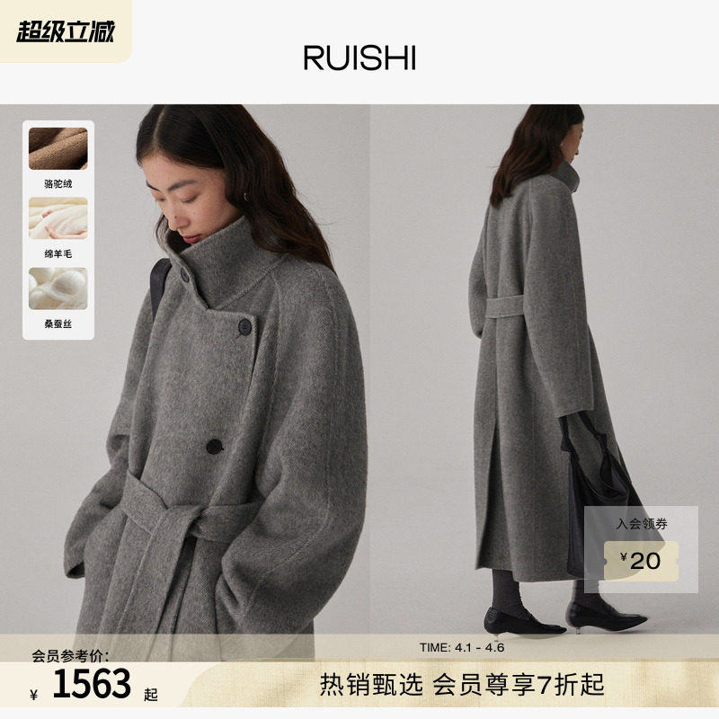 RUISHI芮时重磅驼绒桑蚕丝羊毛慵懒两穿领灰色毛呢大衣秋冬外套女