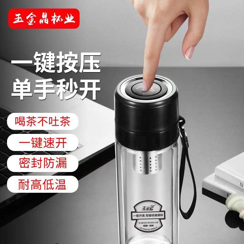 全新一键速开双层玻璃杯便携式车载泡茶杯家用大容量按压开盖水杯