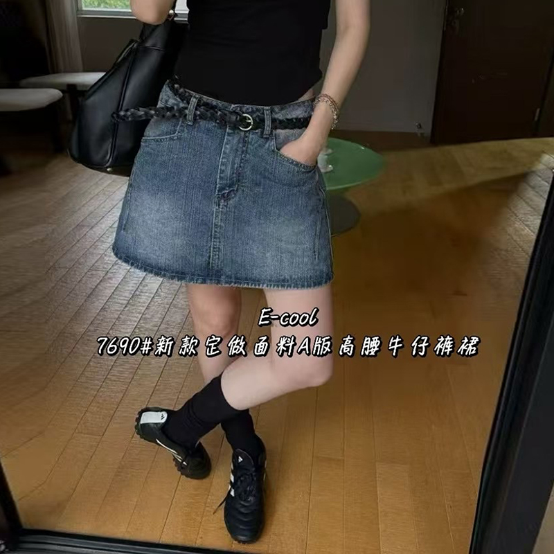 复古高腰土弹牛仔半身裙女显瘦修身防走光半身裙裤带内衬a字短裙