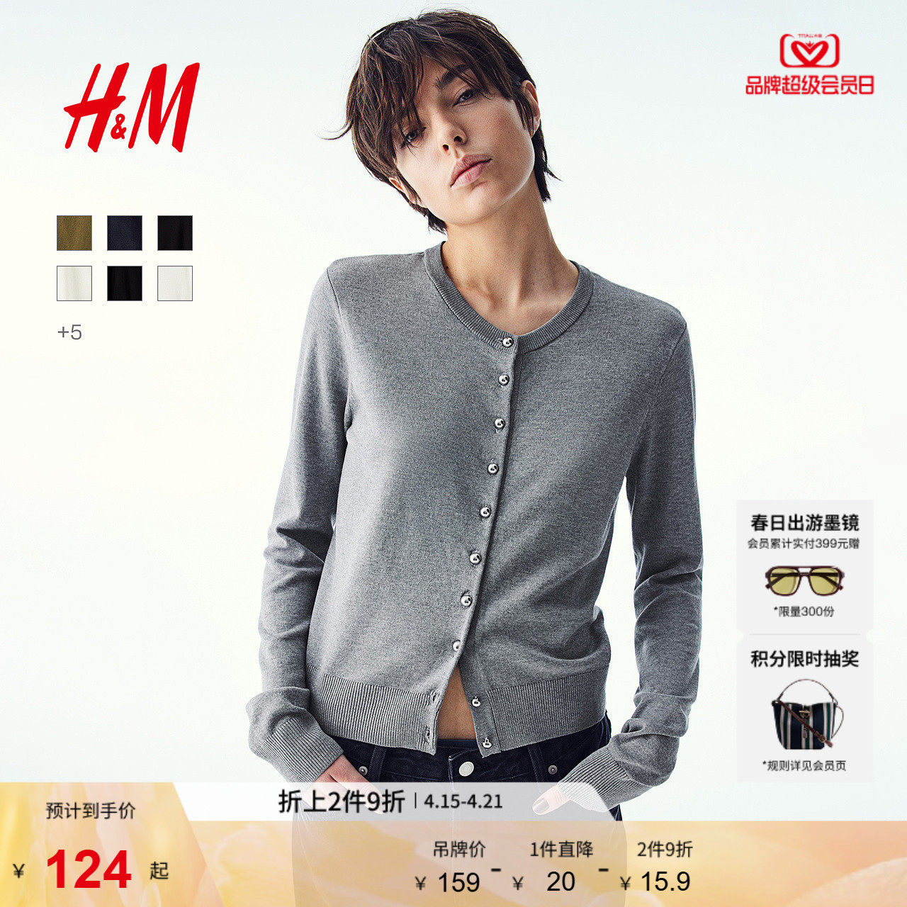 HM女装毛针织衫夏季打底衫外搭开衫薄款圆领针织休闲外套1237776