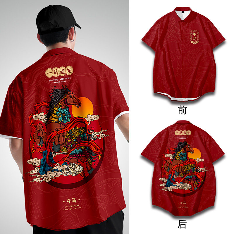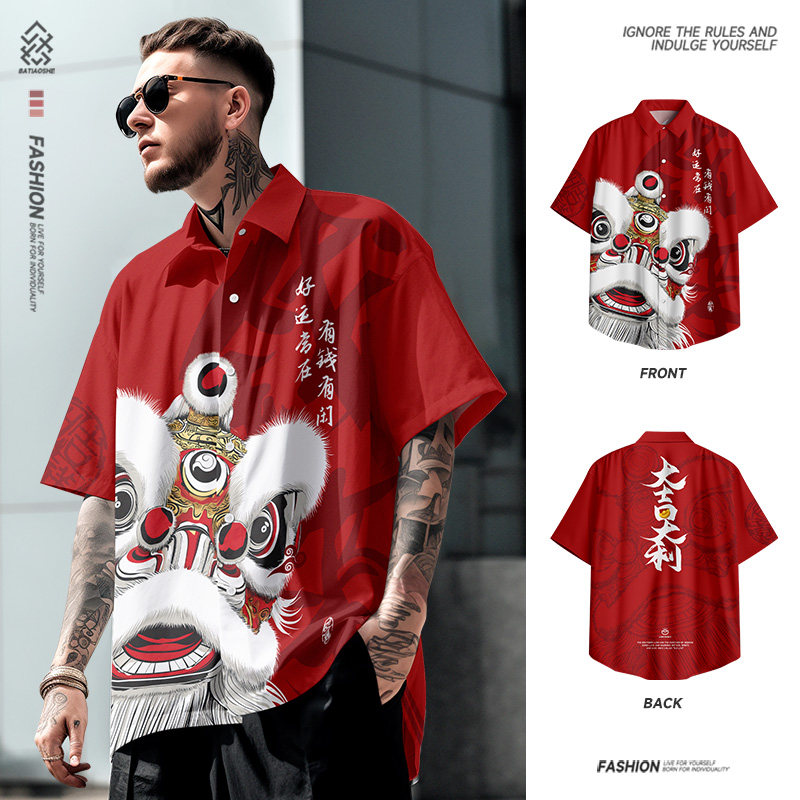 红色短袖衬衫男春夏季薄款中国风潮牌休闲复古唐装新中式衬衣外套