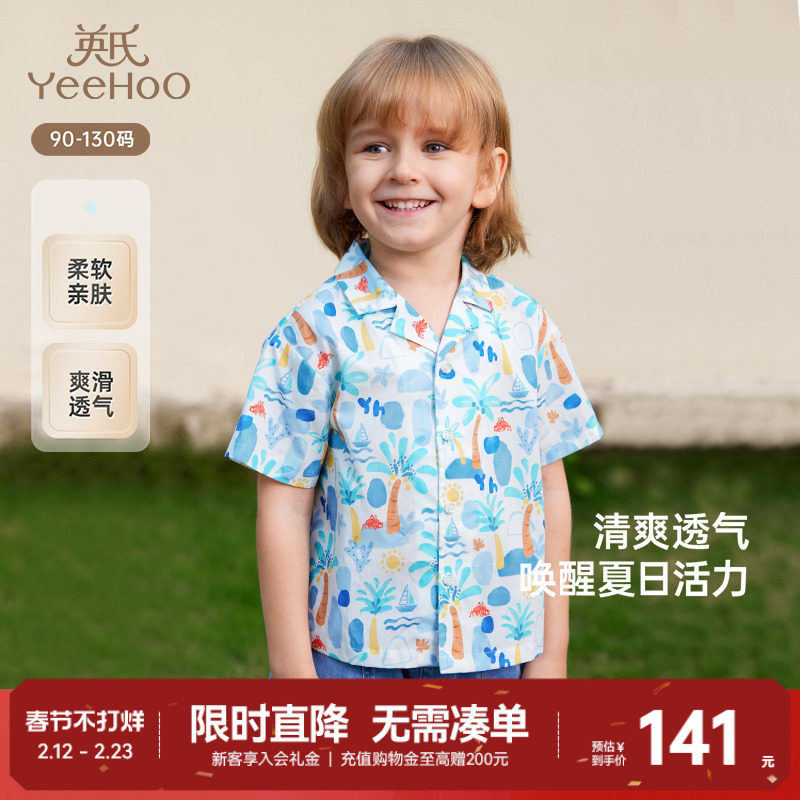 英氏儿童短袖衬衫夏季薄款户外男童百搭宽松休闲海边度假沙滩衬衣
