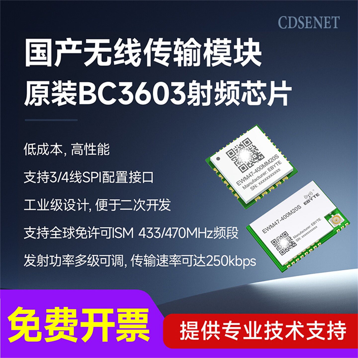 国产BC3603无线传输模块433/470MHz远距离通讯SPI射频模组小尺寸