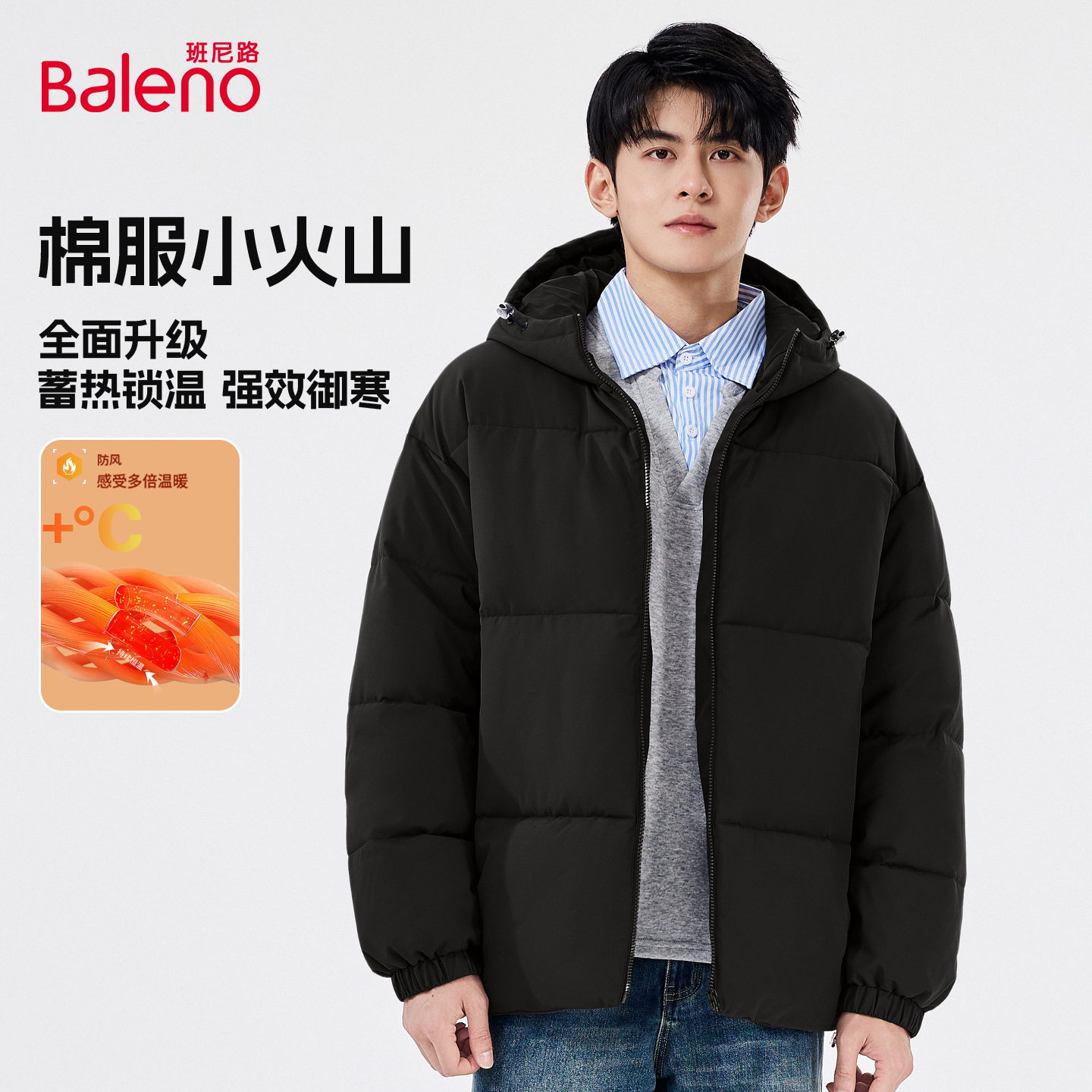 班尼路短款连帽棉服男2025冬季新款青少年黑色棉衣耐脏保暖外套A