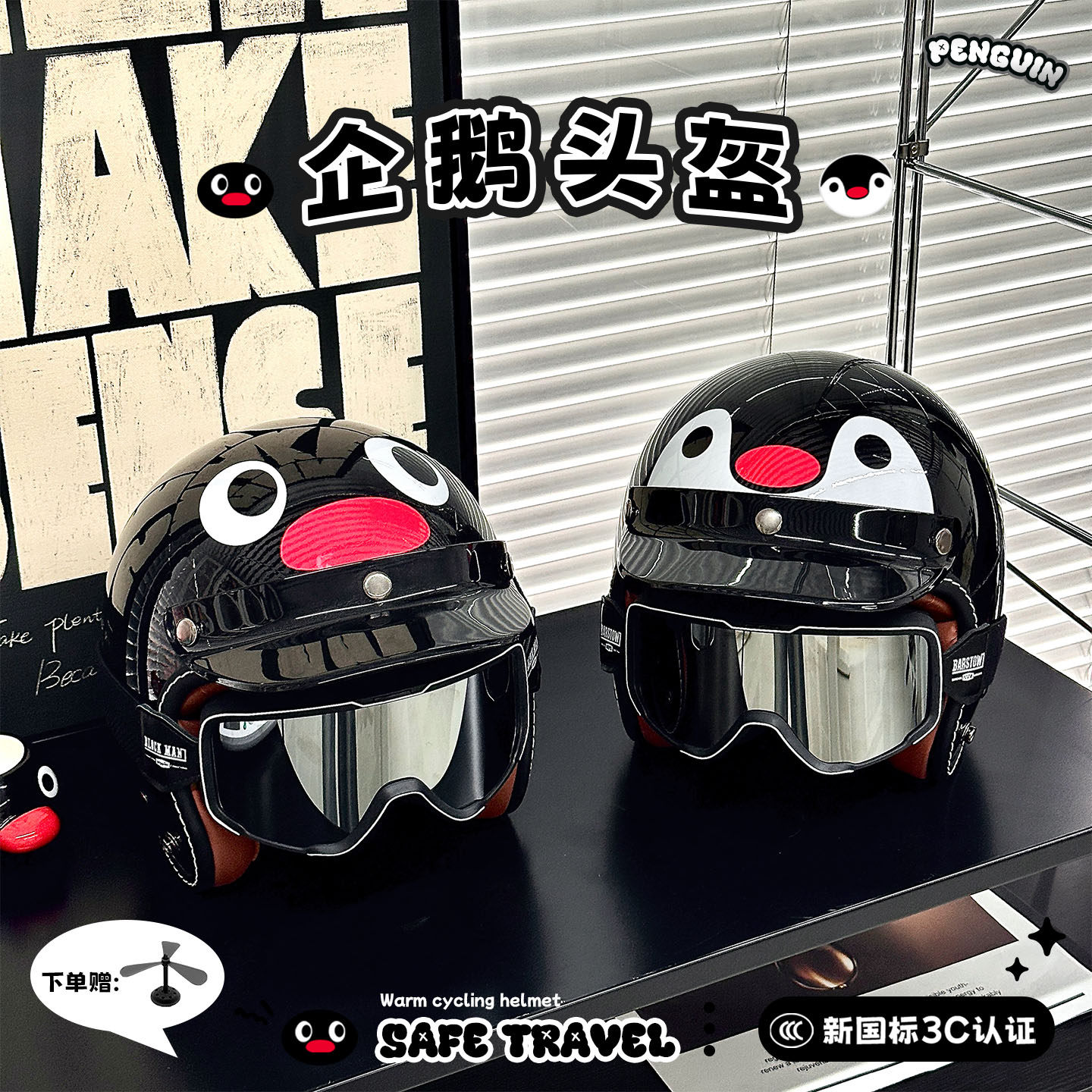 新国标3c认证卡通企鹅头盔电动车四分之三盔电瓶摩托车头盔安全帽