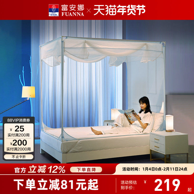富安娜家用卧室全包大空间防摔蚊帐三开门加密防蚊一体式方顶床帘