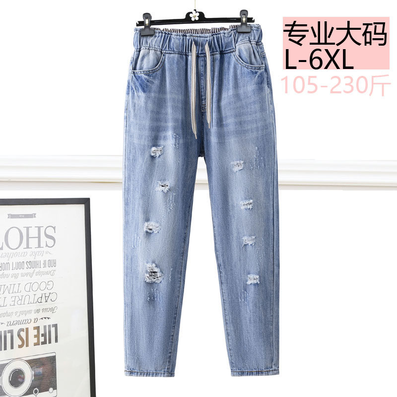 300斤特大码女装胖mm松紧腰牛仔裤女破洞宽松显瘦百搭哈伦九分裤