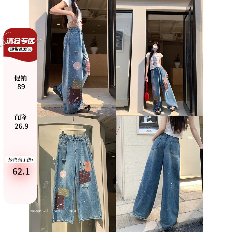 大码女装胖mm复古设计拼接贴布牛仔裤夏季新款辣妹破洞拖地长裤