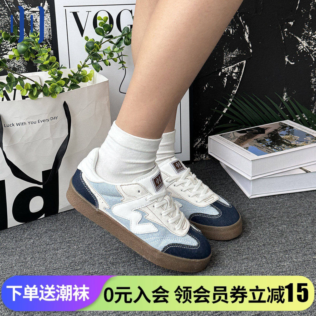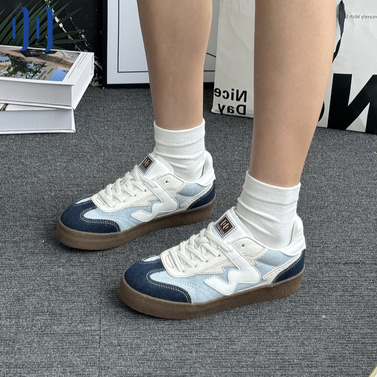 顽刻ollieskate牛仔蓝配色皮质生胶底W系列男女国潮德训滑板鞋