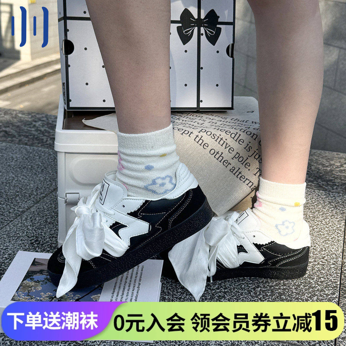顽刻ollieskate黑色皮质蝴蝶结丝带生胶W系列国潮男女德训滑板鞋