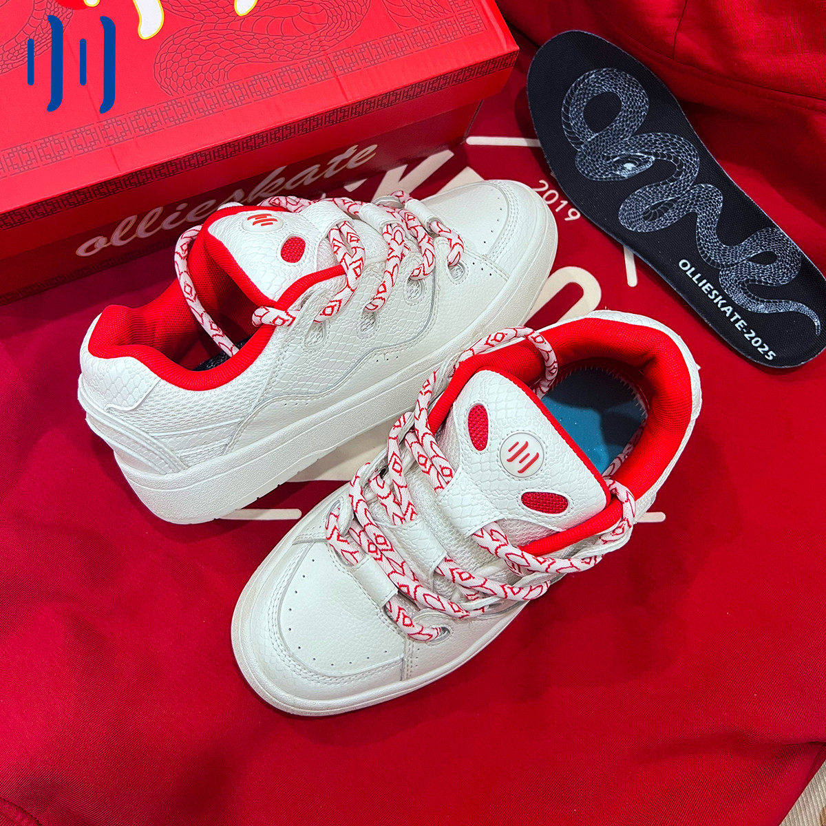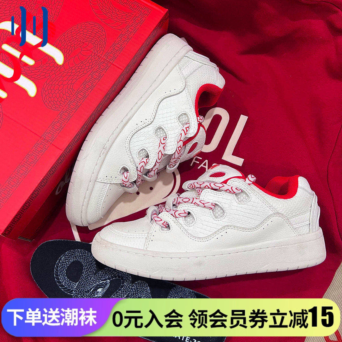 顽刻ollieskate面包鞋蛇年生肖款白红皮质拼接BAKE男女国潮滑板鞋
