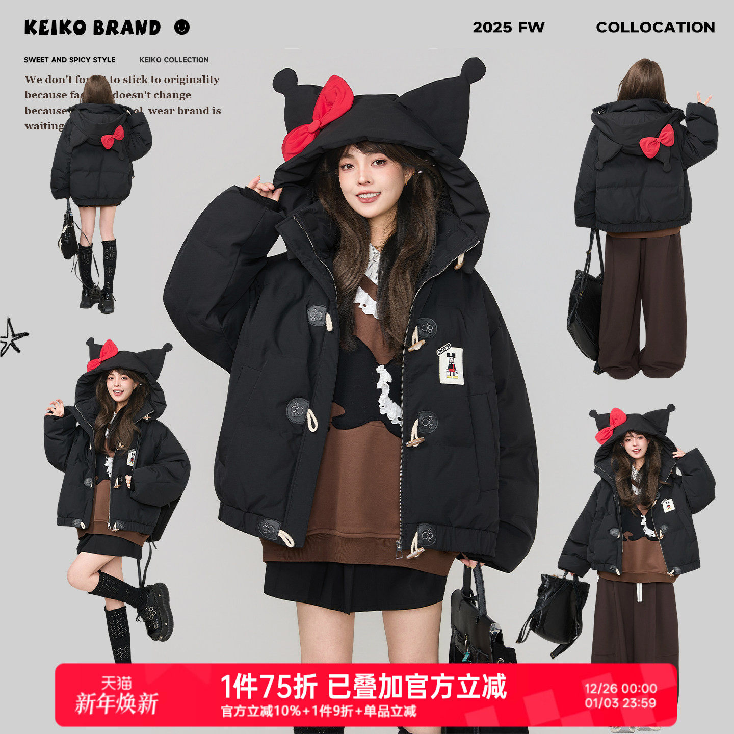 KEIKO 设计感小丑帽黑色棉服外套女25冬季少女感加厚保暖短款棉袄