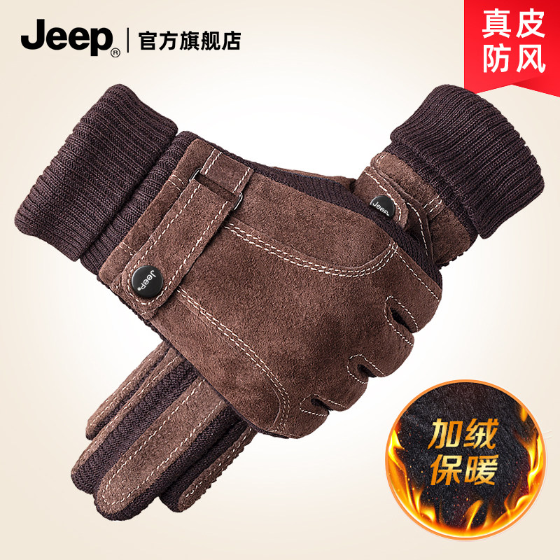 jeep吉普皮手套男士冬季加绒骑行摩托车加厚触屏真皮保暖防风手套