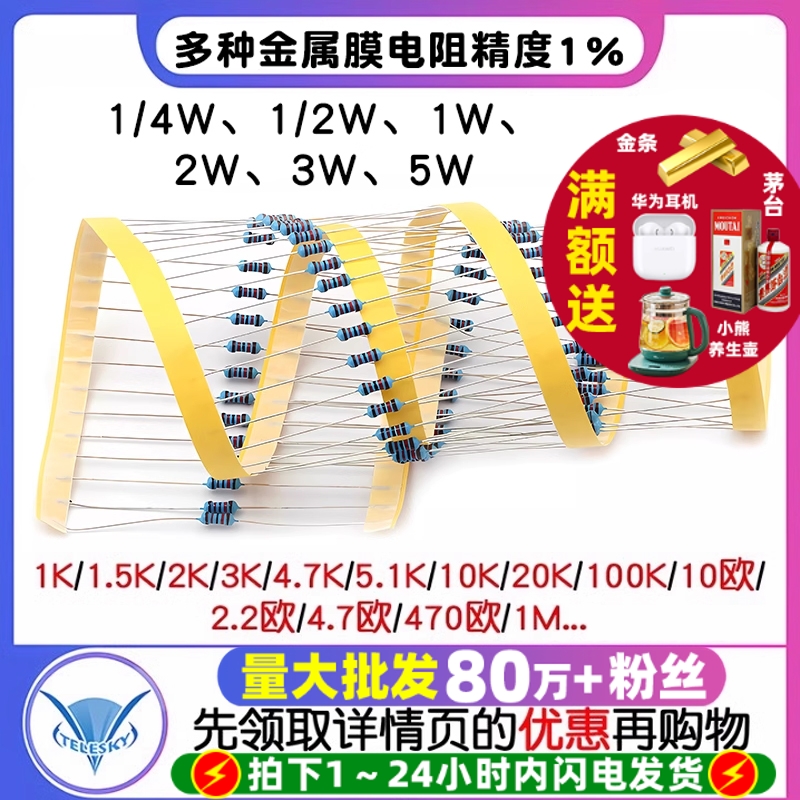 1/4W金属膜电阻包1W2W3W直插色环电子元件包19/30/41/130种1%常用