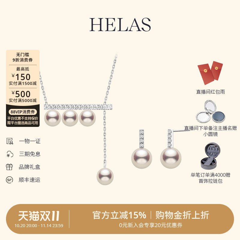 HELAS赫拉音符系列高亮Akoya海水珍珠项链耳钉套装18K金珠宝礼物