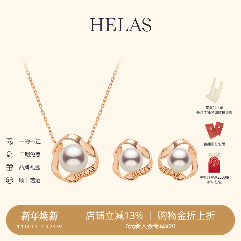 HELAS赫拉山茶花高亮Akoya海水珍珠项链耳钉18K金耳饰套装礼物