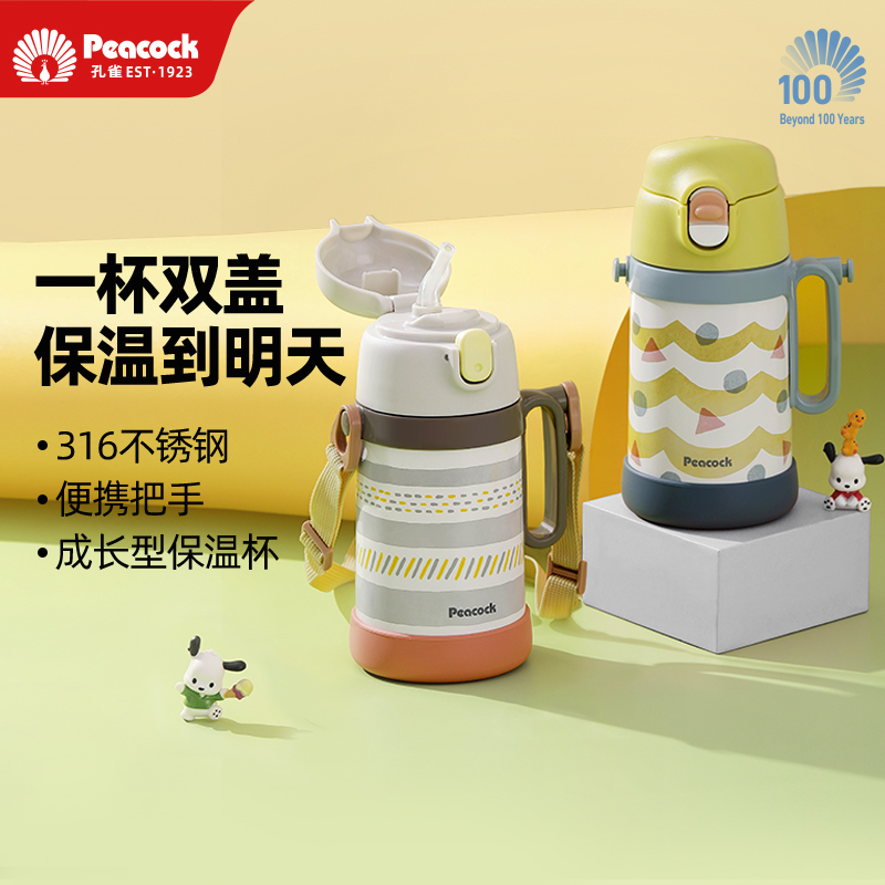 Peacock日本孔雀儿童吸管保温杯316学生水杯女生男生水壶把手背带