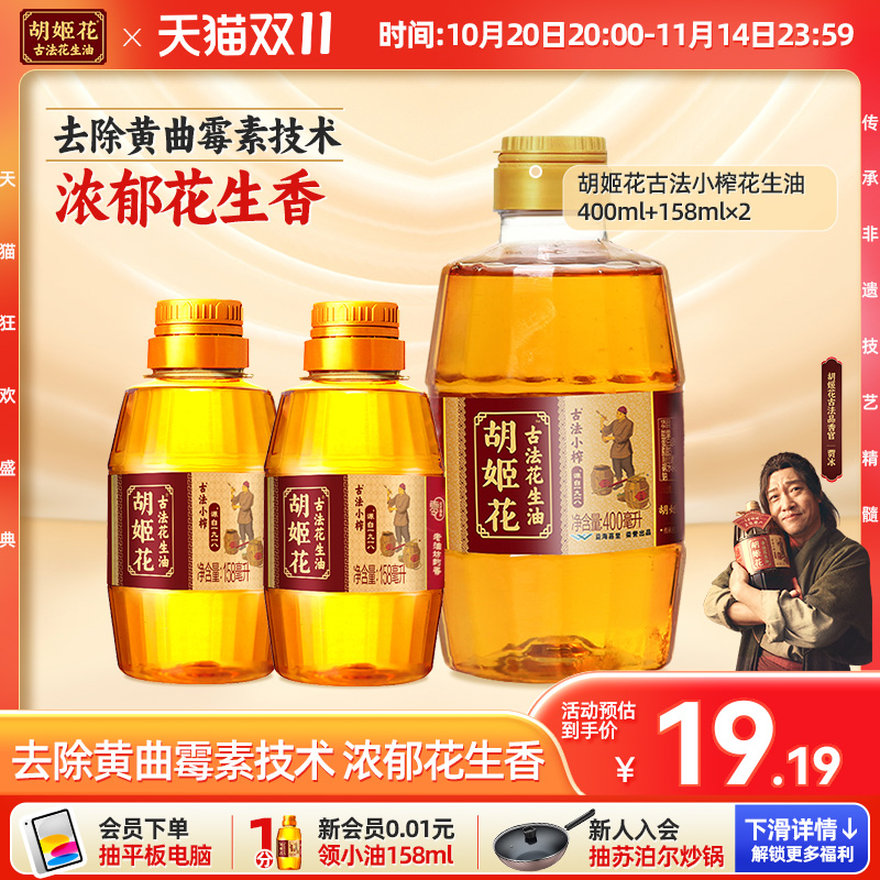 胡姬花古法小榨花生油400ml*2+158ml食用油压榨宿舍家用便携装
