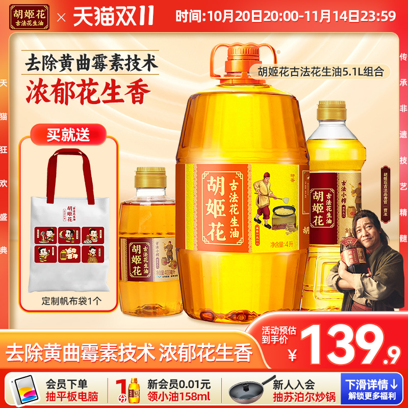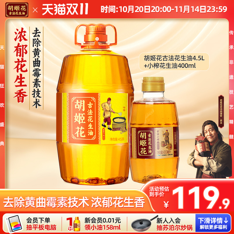 超值组合】胡姬花古法花生油4.9L组合装食用油粮油一级压榨大桶装