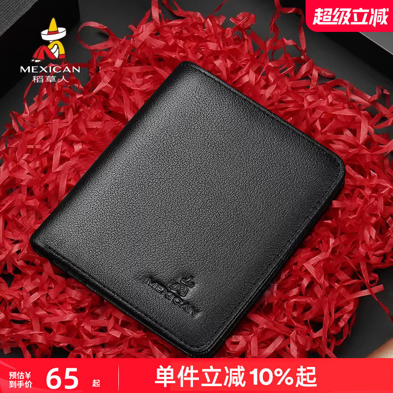 稻草人钱包男短款休闲牛皮皮夹新款简约真皮薄款零钱卡包竖款钱夹