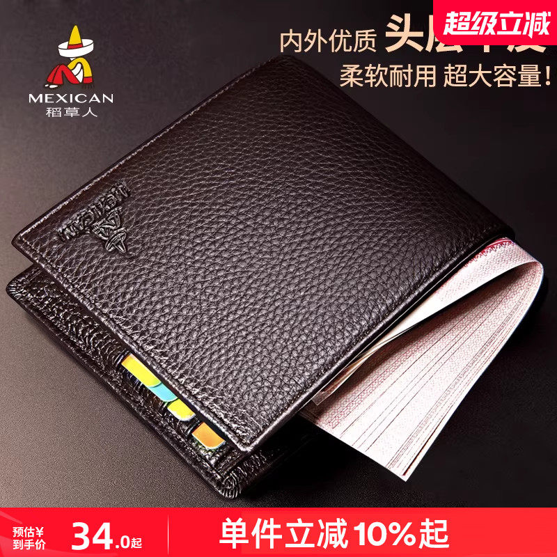 稻草人钱包男士短款真皮潮牌牛皮钱夹小卡包休闲折叠软皮夹爸爸款