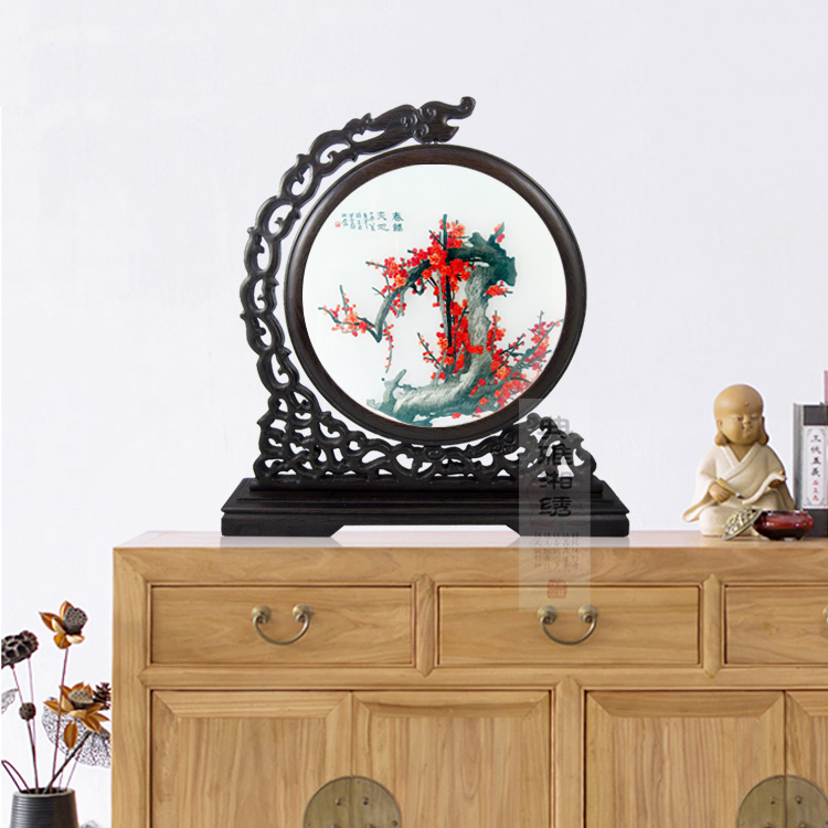 新品湘绣红梅花双面绣20鸡翅木纯手工刺绣春归天地办公工艺品摆件