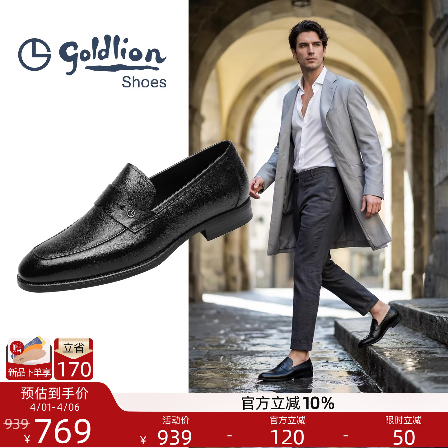 金利来男鞋 2026春季新款真皮商务一脚蹬乐福鞋男士黑色套脚皮鞋