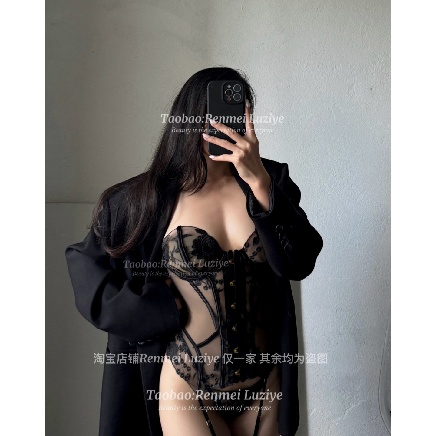 RenmeiLuziye【巴黎假期】高级刺绣透视塑身鱼骨法式抹胸内衣套装