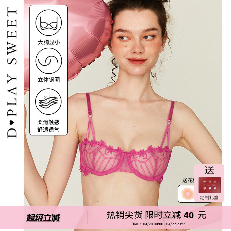 DPLAYSWEET法式玫粉刺绣网纱性感超薄聚拢大胸显小内衣文胸套装女