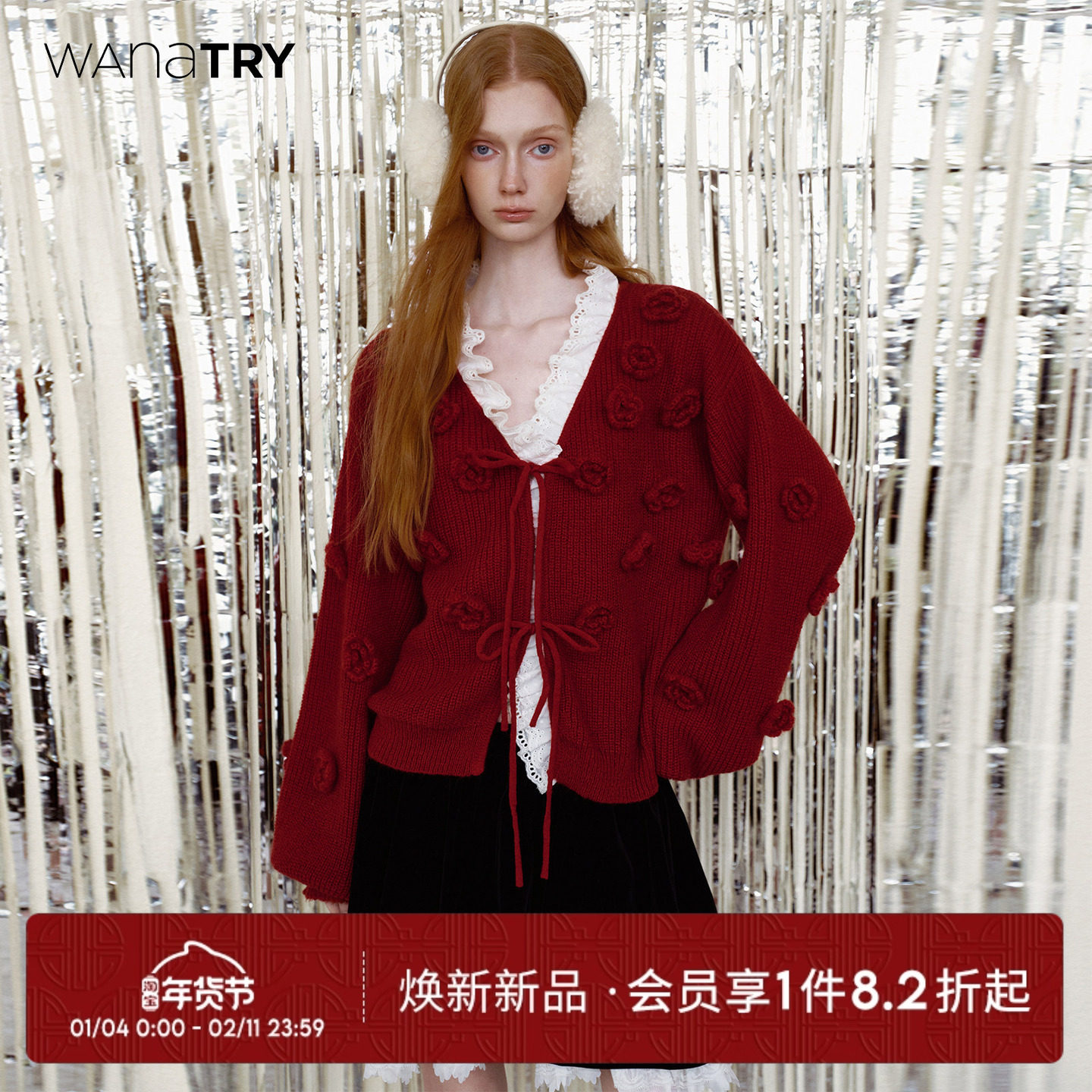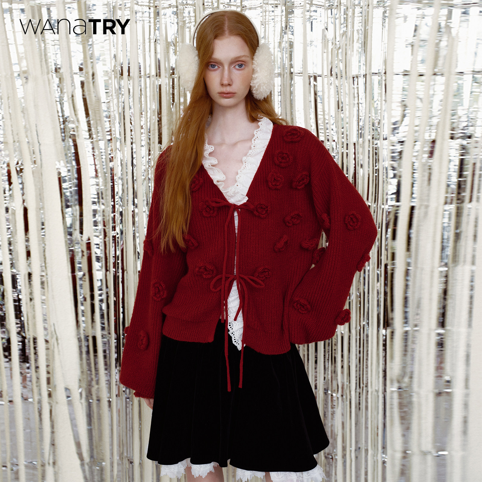 【明星同款】wana try羊毛马海毛花朵领口可拆卸开衫25冬红色毛衣