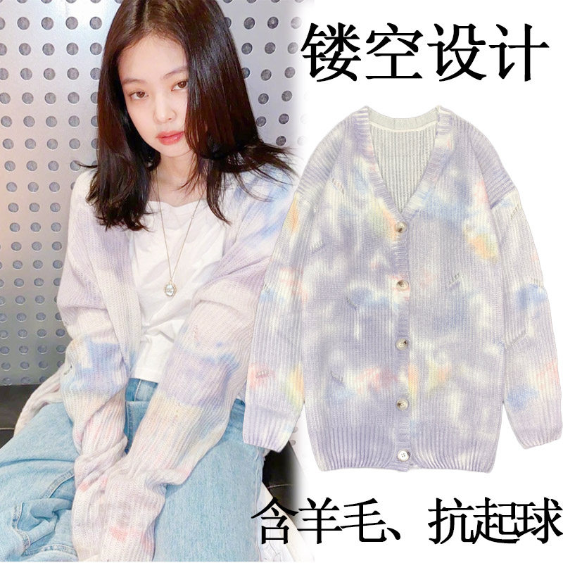 Jennie金智妮明星同款开衫毛衣女韩版宽松扎染色镂空针织外套潮