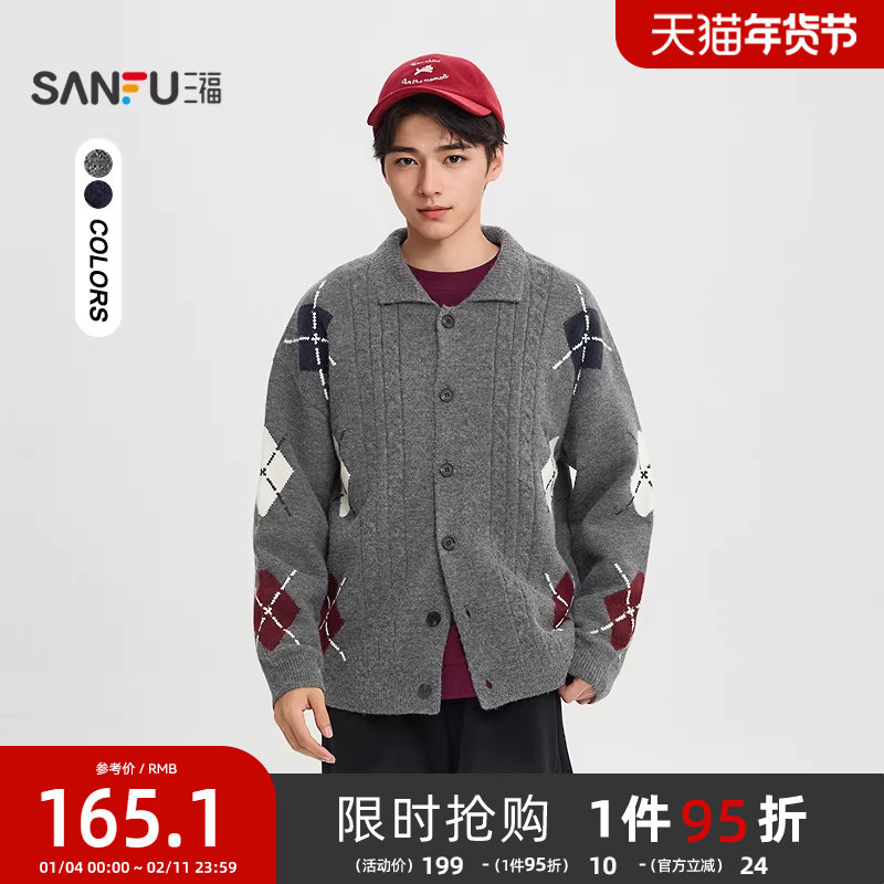 【明星同款】三福2025冬季男士复古菱格毛衣翻领开衫上衣513303