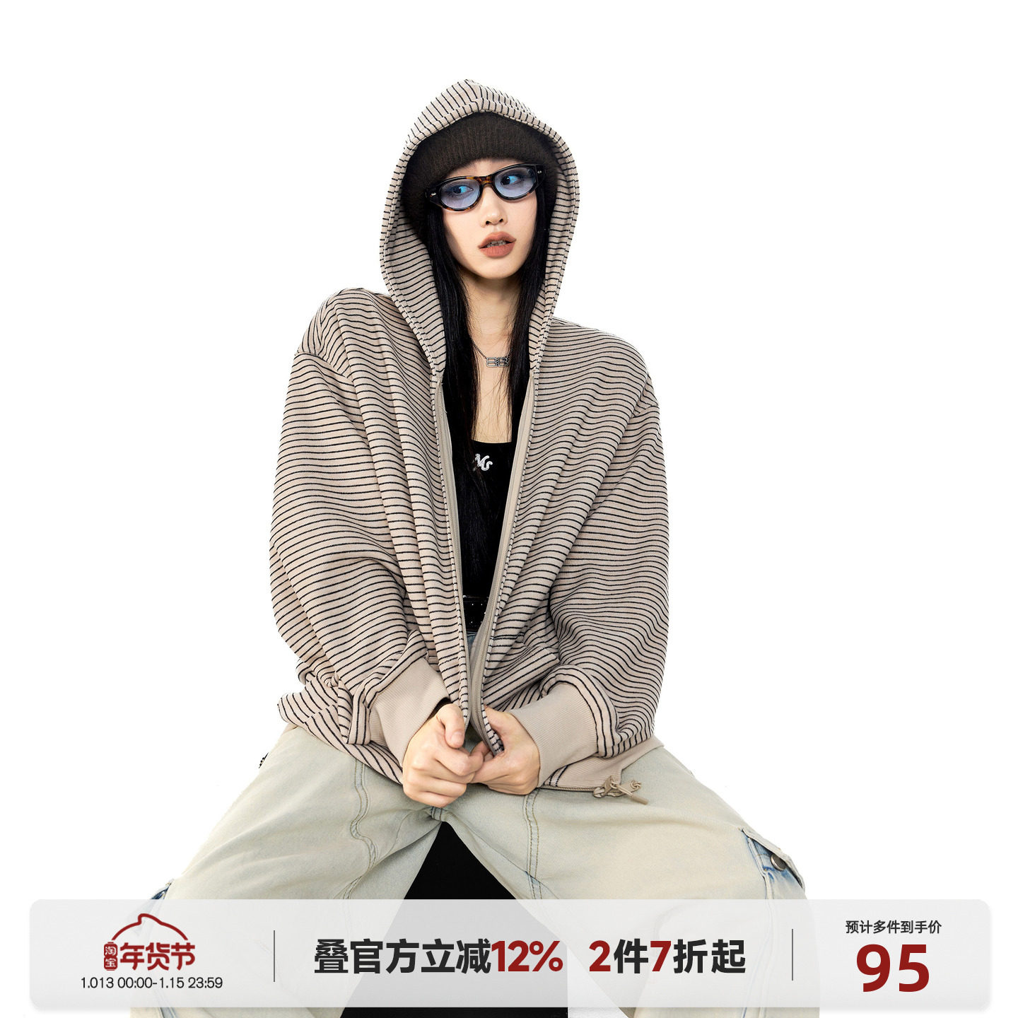 ICHMODE 明星同款连帽条纹外套女春季新款拉链运动卫衣开衫上衣
