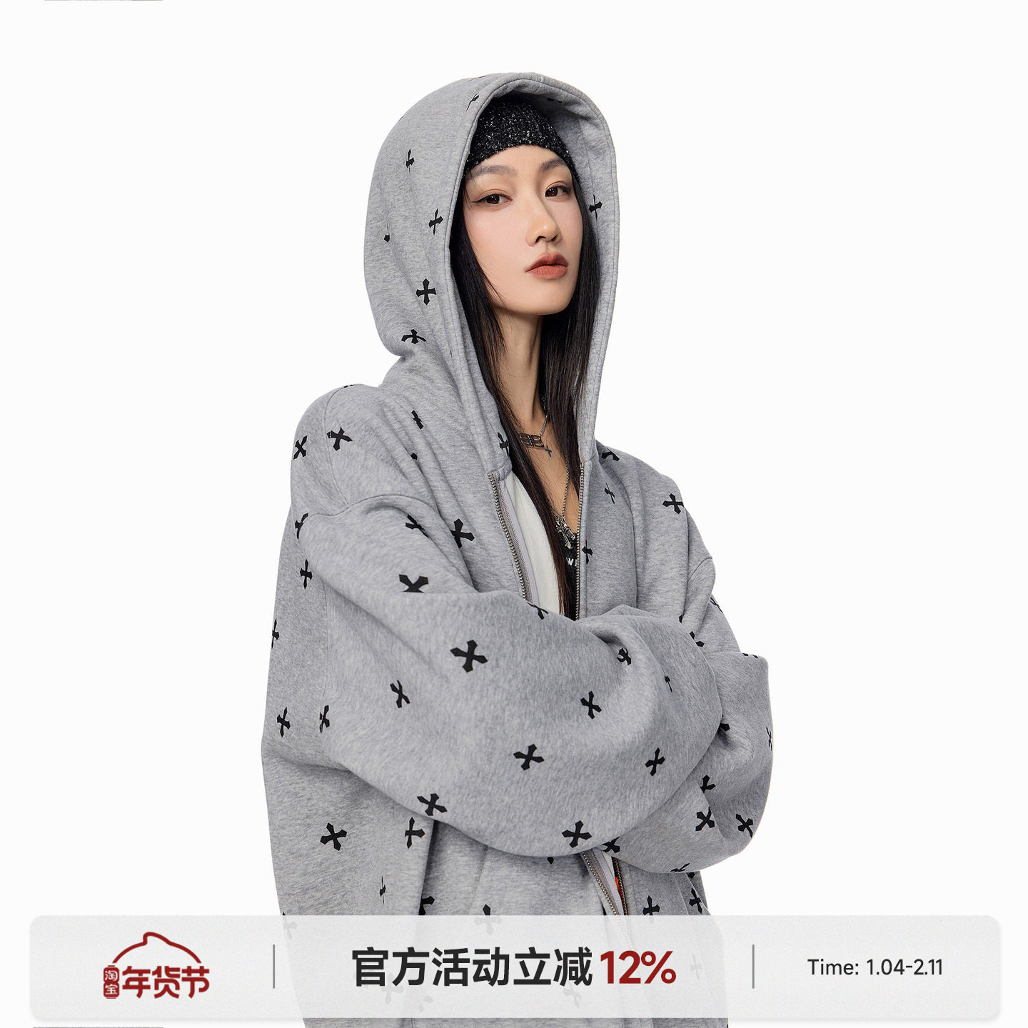 ICHMODE 明星同款哥特风十字满印加绒灰色卫衣外套女春秋开衫上衣