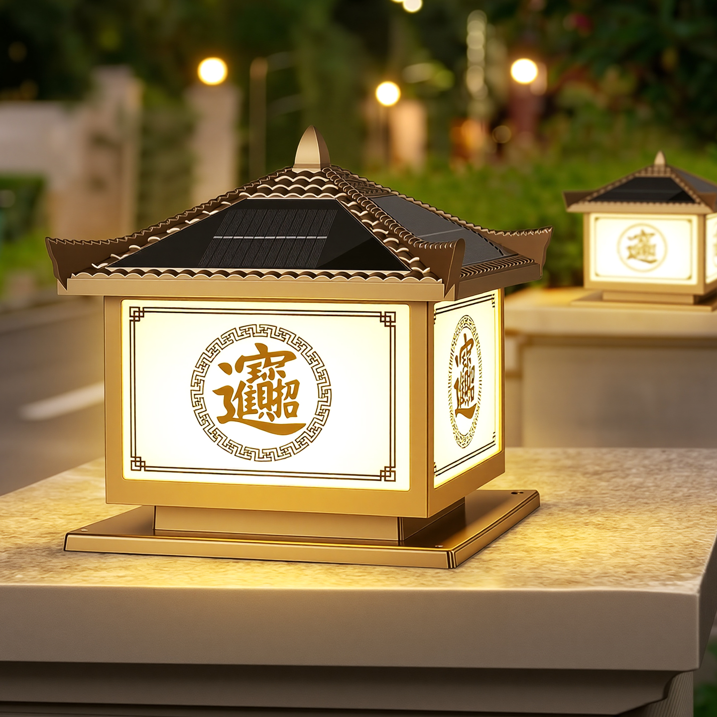 中式全铜太阳能门柱灯户外防水别墅墙头灯简约现代花园围墙柱子灯