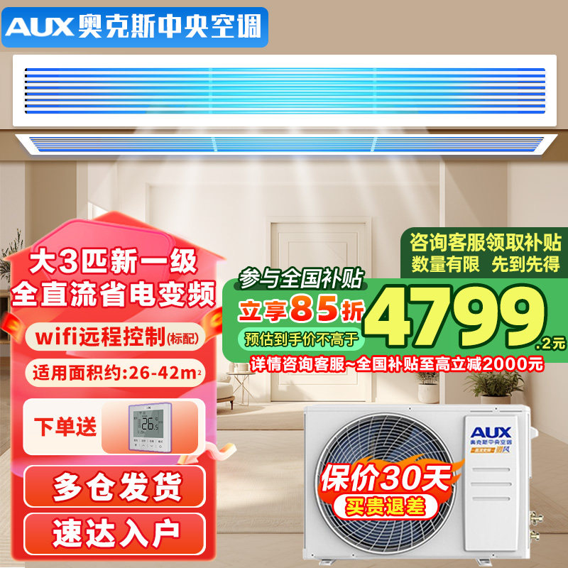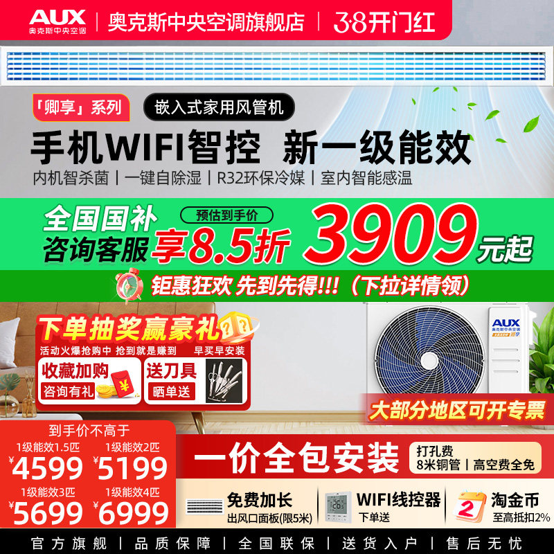 奥克斯中央空调大1.5/2/3匹全直流一级风管机变频家用一拖一客厅