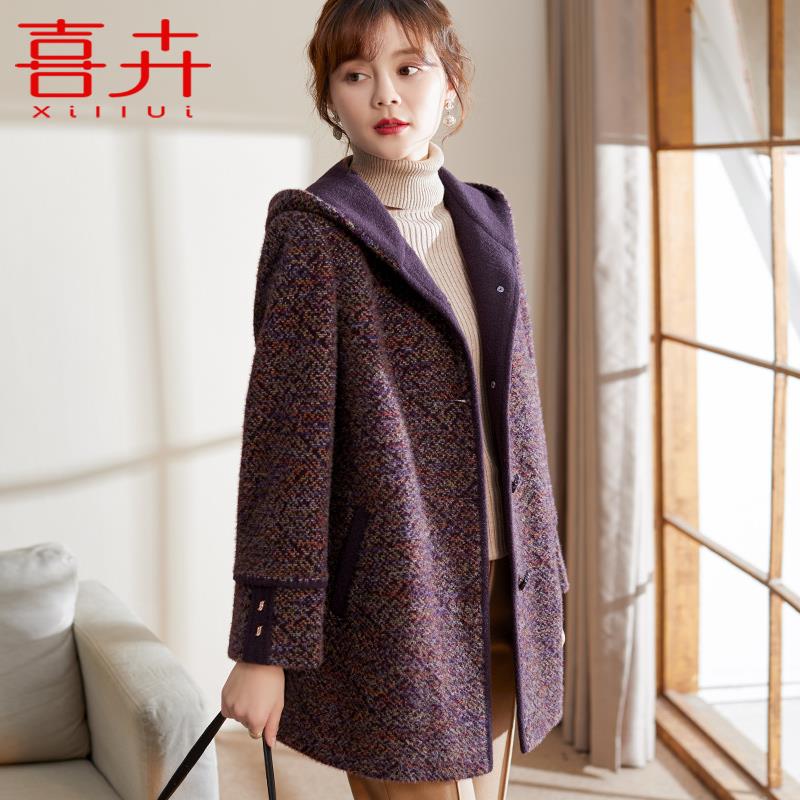 喜卉妈妈冬装连帽呢子大衣中长版洋派毛呢外套中老年女装秋冬上衣