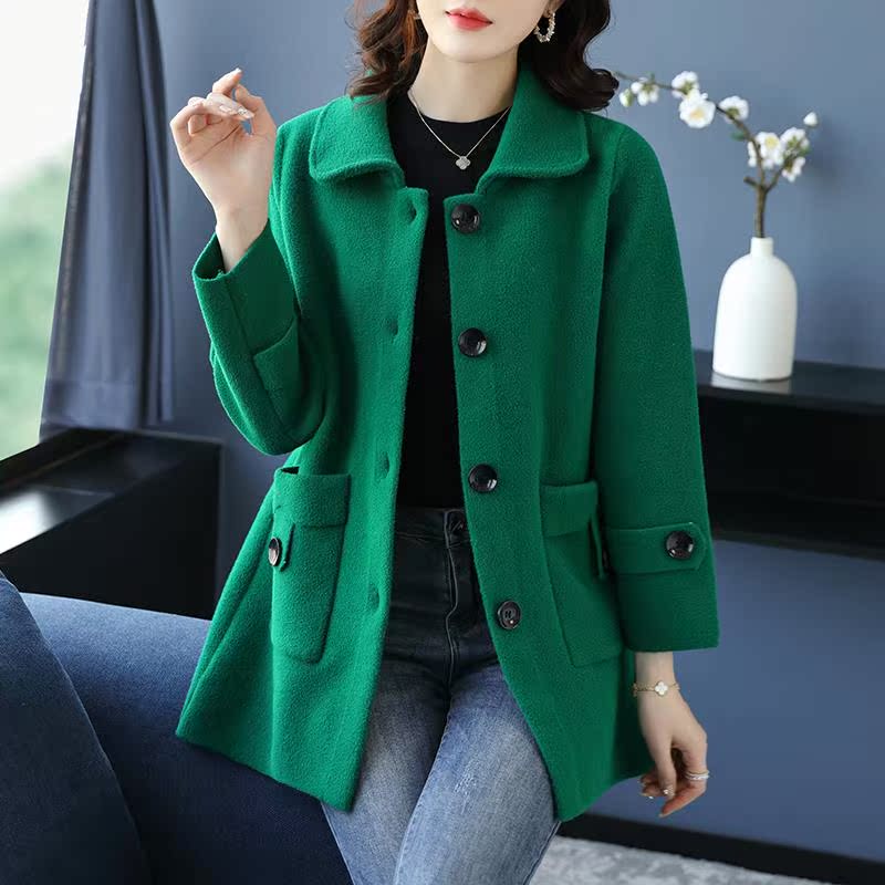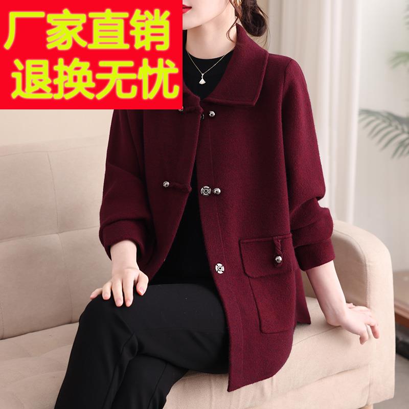 高档双面呢大衣女中长版春秋新款中年妈妈时尚牛角扣纯色毛呢外套