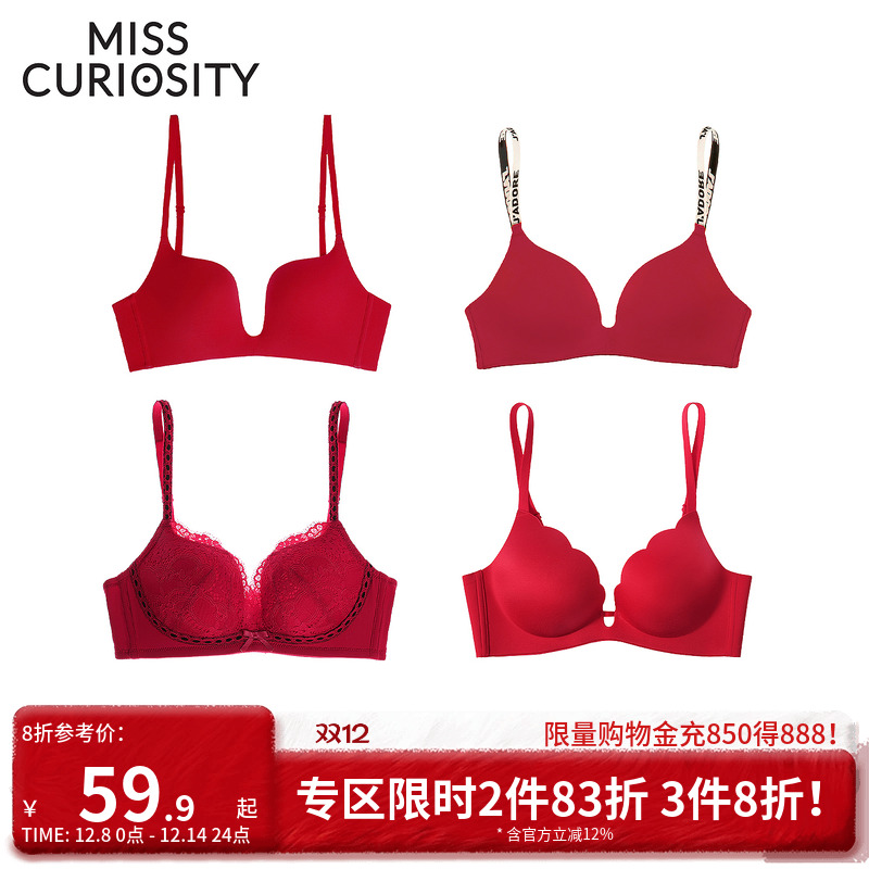 菇娘家本命年红色内衣套装女无痕大胸显小文胸结婚送礼马年大红盒