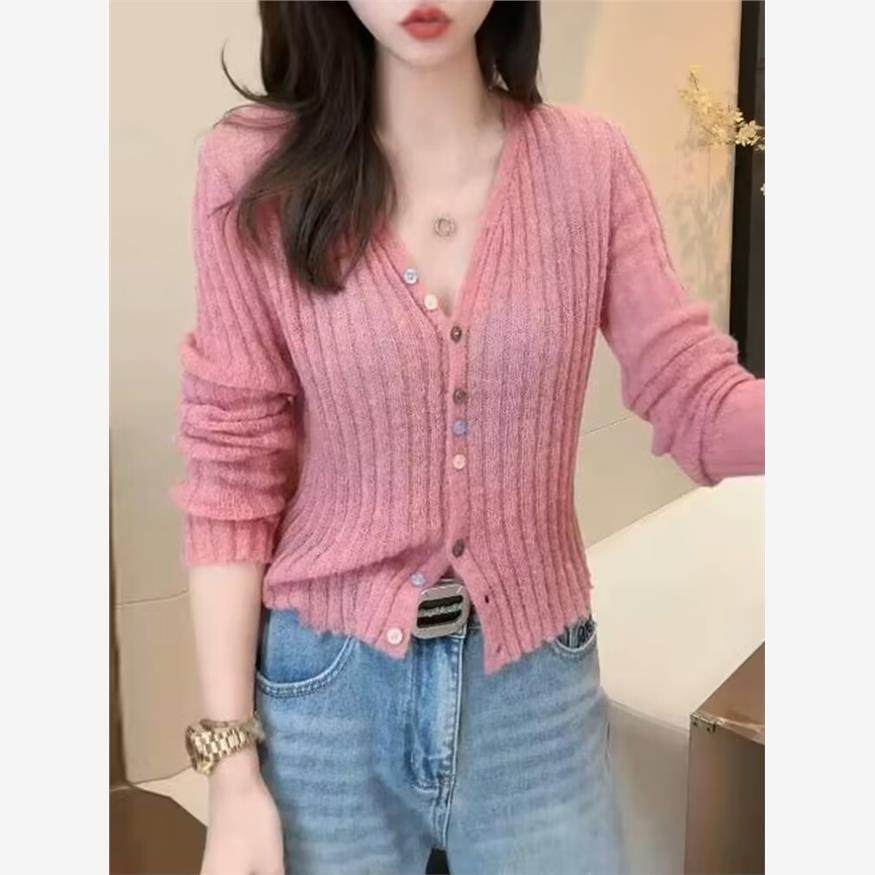 彩色纽扣v领针织开衫女性春季服装2025新修身薄全能底长袖上衣
