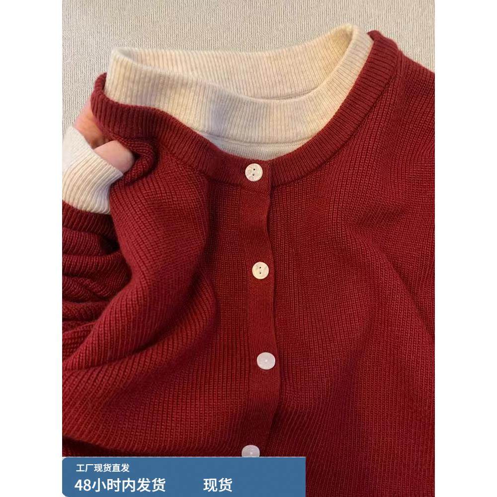 红色圣诞假两件套圆领针织上衣秋冬女性慵懒风格宽松新年毛衣开衫